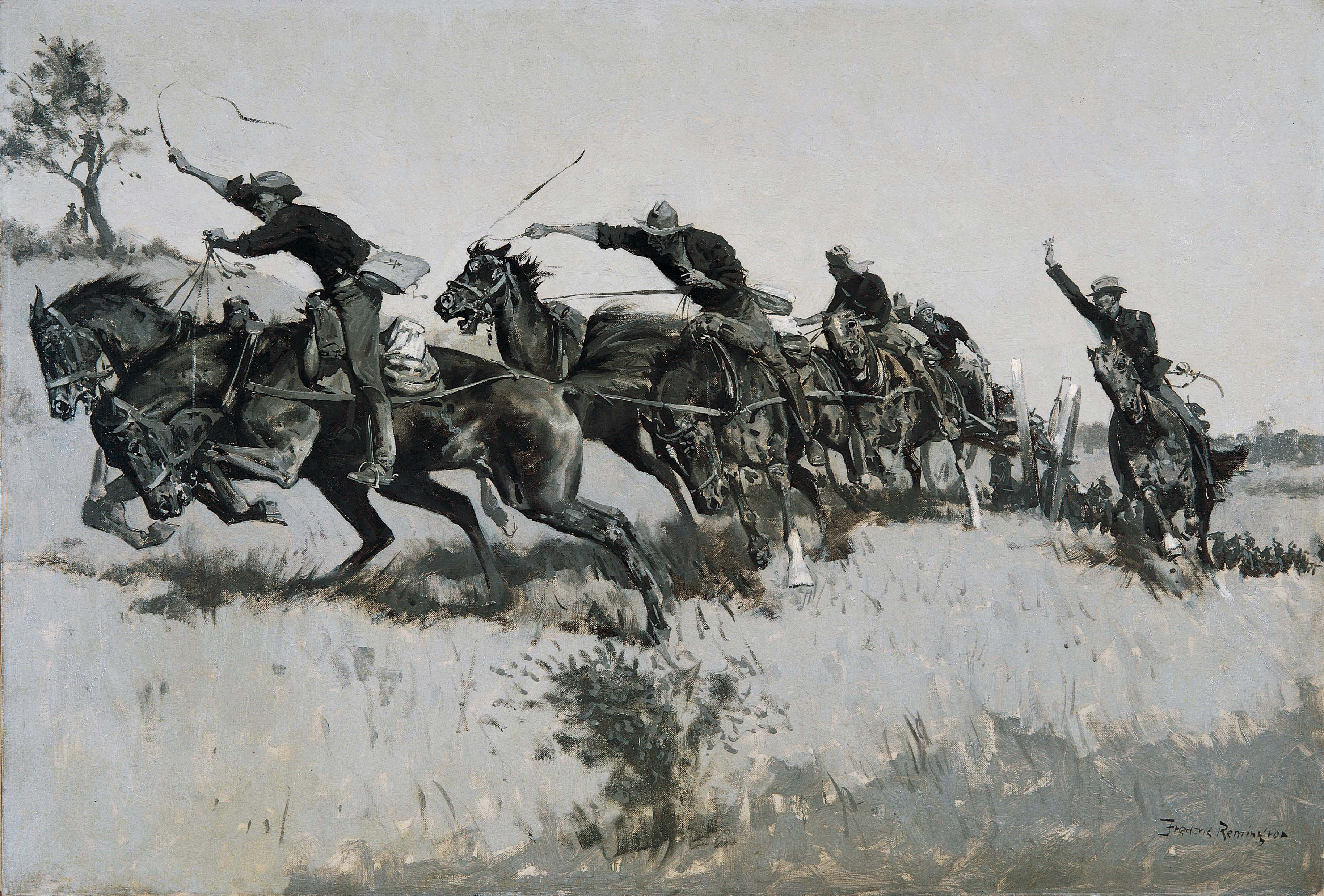 Pictured here: Frederic Remington, Capt. Grimes’s Battery Going Up El Poso Hill, 1898, black and white oil on canvas, 26 ½ x 39 ¾”, Bequest of Mr. Robert Purcell, Frederic Remington Art Museum 1992.002.